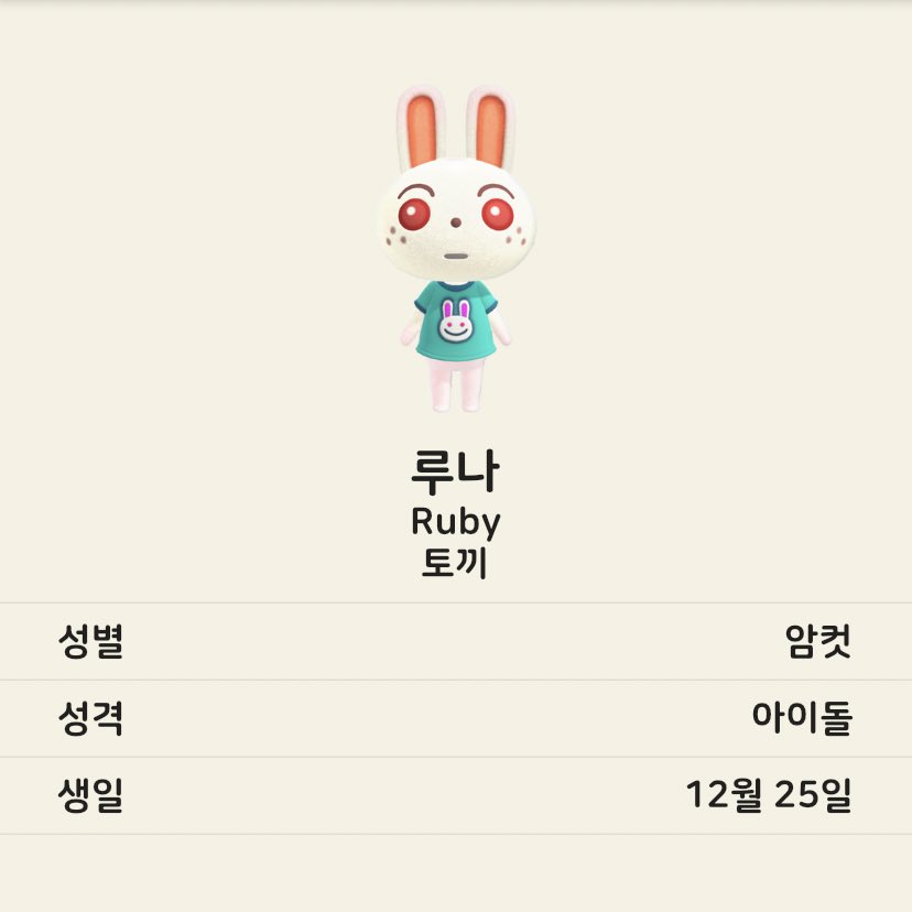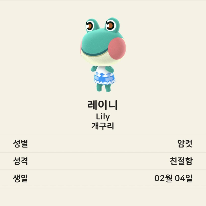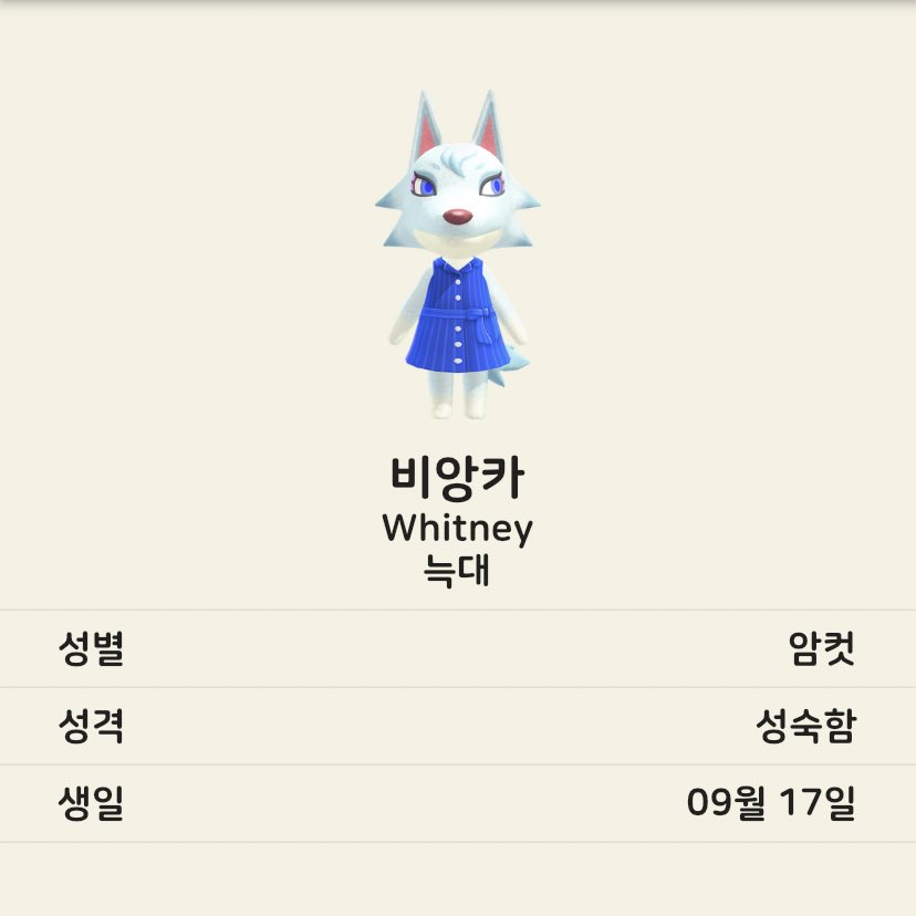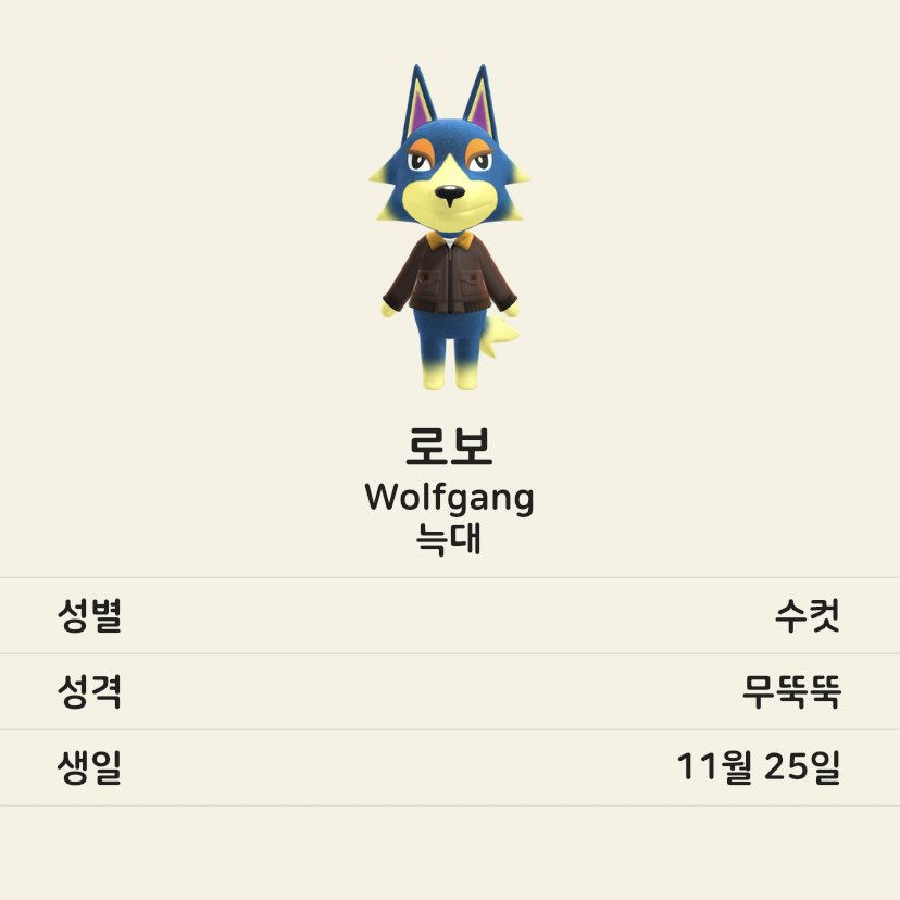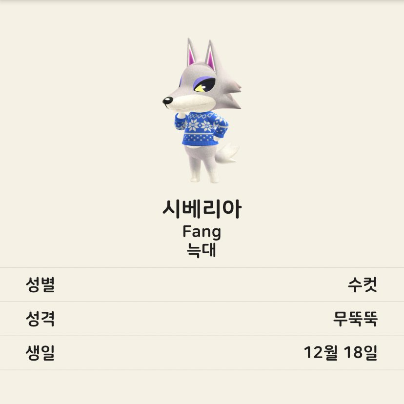 늑대 중에는 시베리아, 비앙카, 로보. 개구리 중엔 레이니. 늑대 주민은 무뚝뚝 성격이 많은 듯한데 그 중 시베리아가 내 눈엔 가장 예쁜 것 같다. 개구리 주민은 비오는 날 비옷을 입지 않는 점이 재미있다.