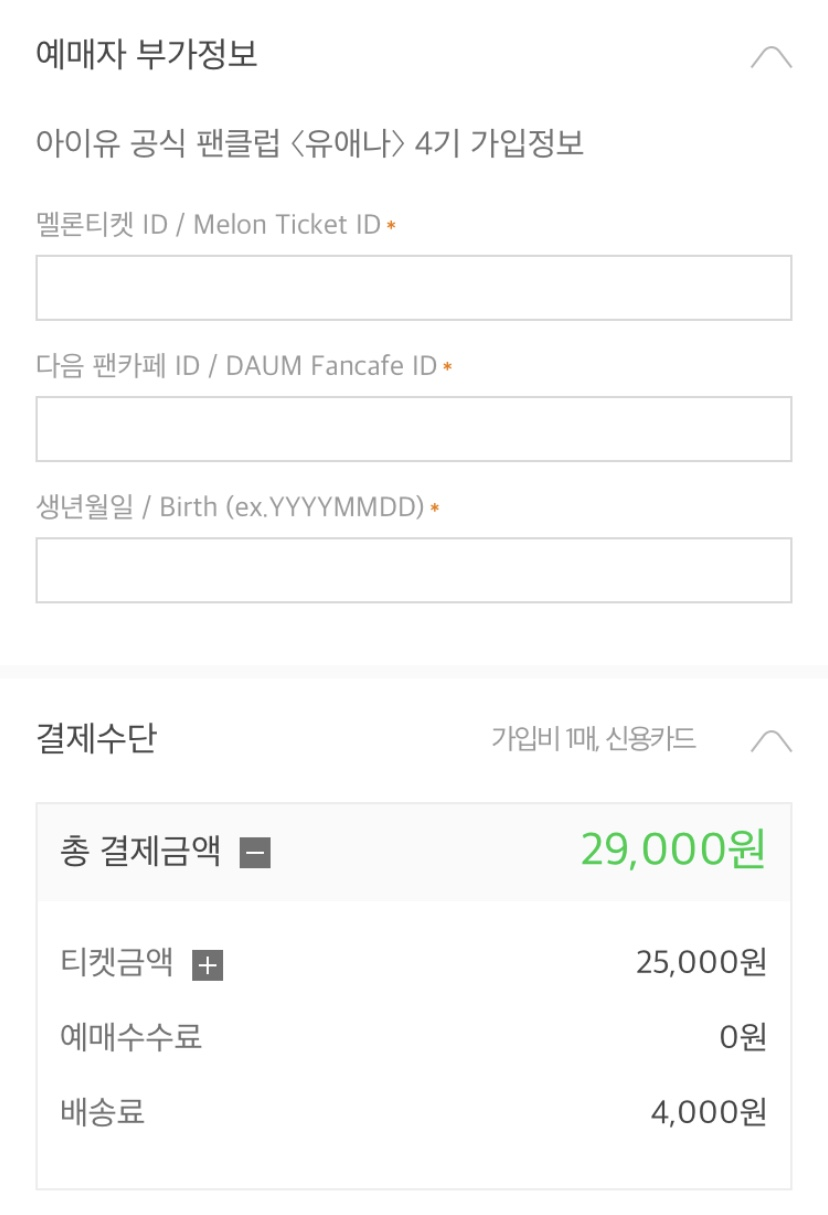 예매하기를 누르면 팬클럽 물품을 받을 주소지와 예매자 부가정보를 입력할 수 있는데 이 부분이 무척 중요하다. 콘서트 선예매 등의 혜택을 받으려면 반드시 '본인명의'의 멜론티켓 ID로 예매를 해야하고 부가정보에도 본인명의의 멜론티켓 ID와 다음카페 ID, 생년월일을 입력해야 한다. 다음 팬카페는 해당 예매정보에 입력한 본인명의의 아이디로 가입 및 등업신청을 할 수 있다. (혹시 가입정보를 잘못 입력했더라도 예매기간동안 수정이 가능하니 걱정마세요 :)