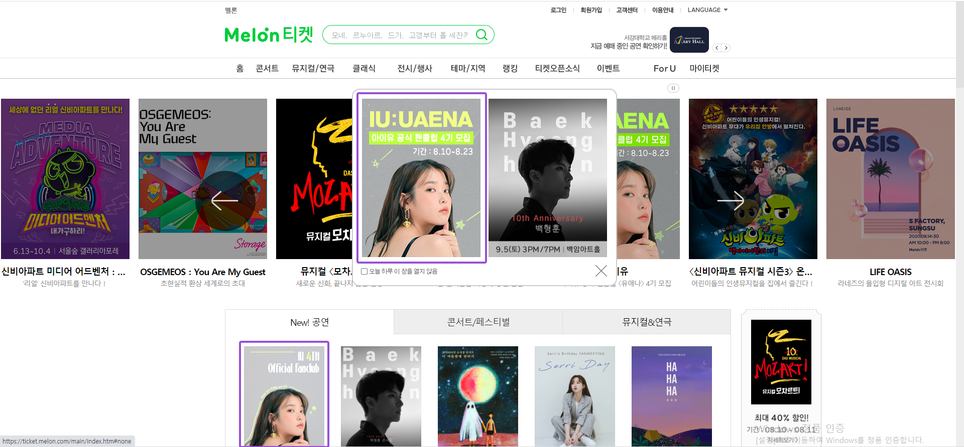 아이유 공식 팬클럽 〈유애나〉 4기 가입신청 기간이 시작됐다. 오픈하자마자 들어가야지! 해놓고 점심 먹느라 늦었네. 멜론티켓 메인화면에 유애나 가입 배너가 뜨니까 어렵지 않게 찾아들어갈 수 있다.