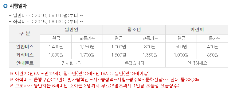 광주광역시 버스운행정보에 나와있는 버스 요금표
