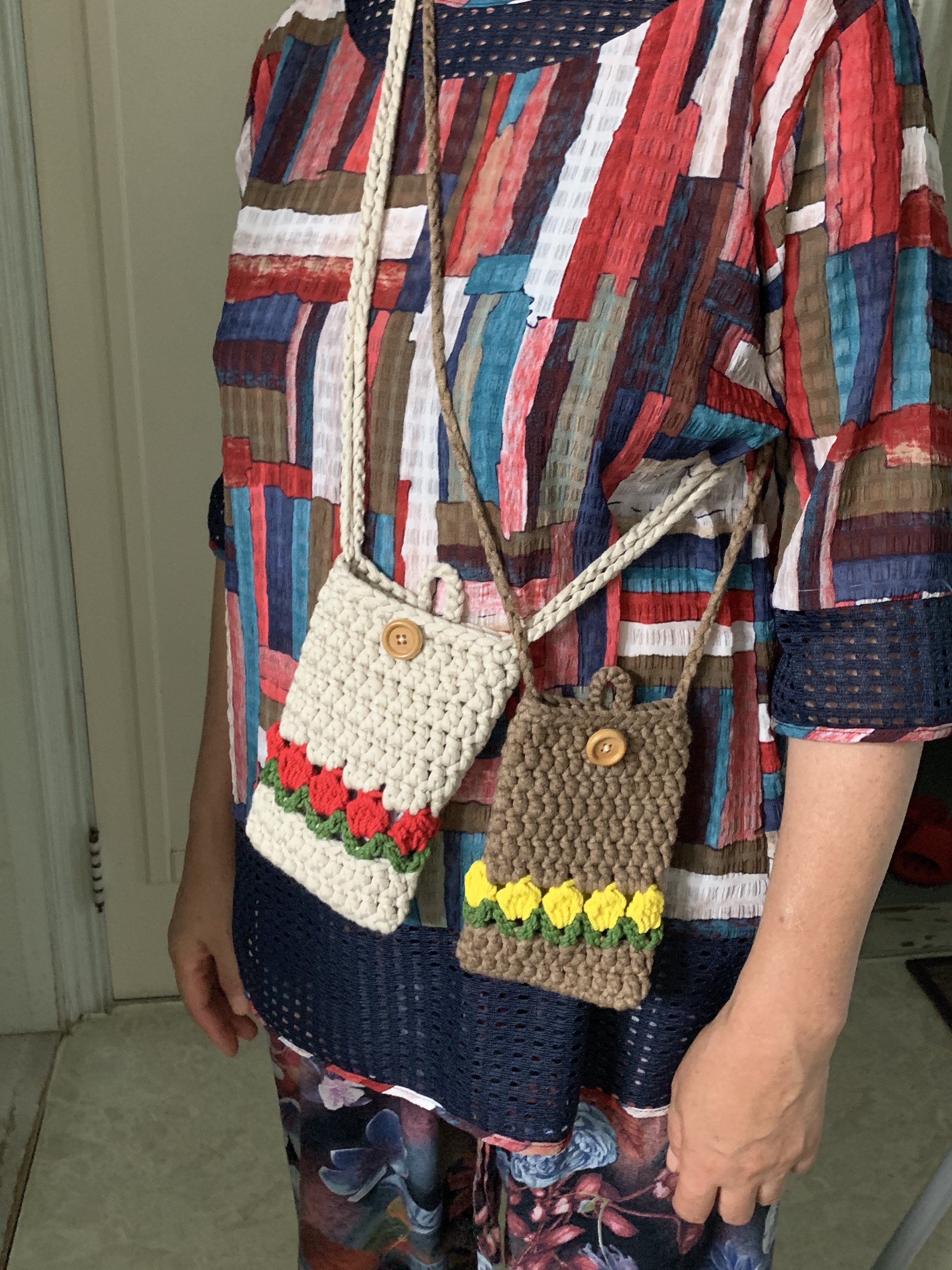 베이지 바탕에 빨간 튤립으로 만든 내 가방은 어깨끈을 두줄로 주문했는데 확실히 덜 늘어진다. 크로스 끈을 짧게 매는 편이라 딱 좋다.