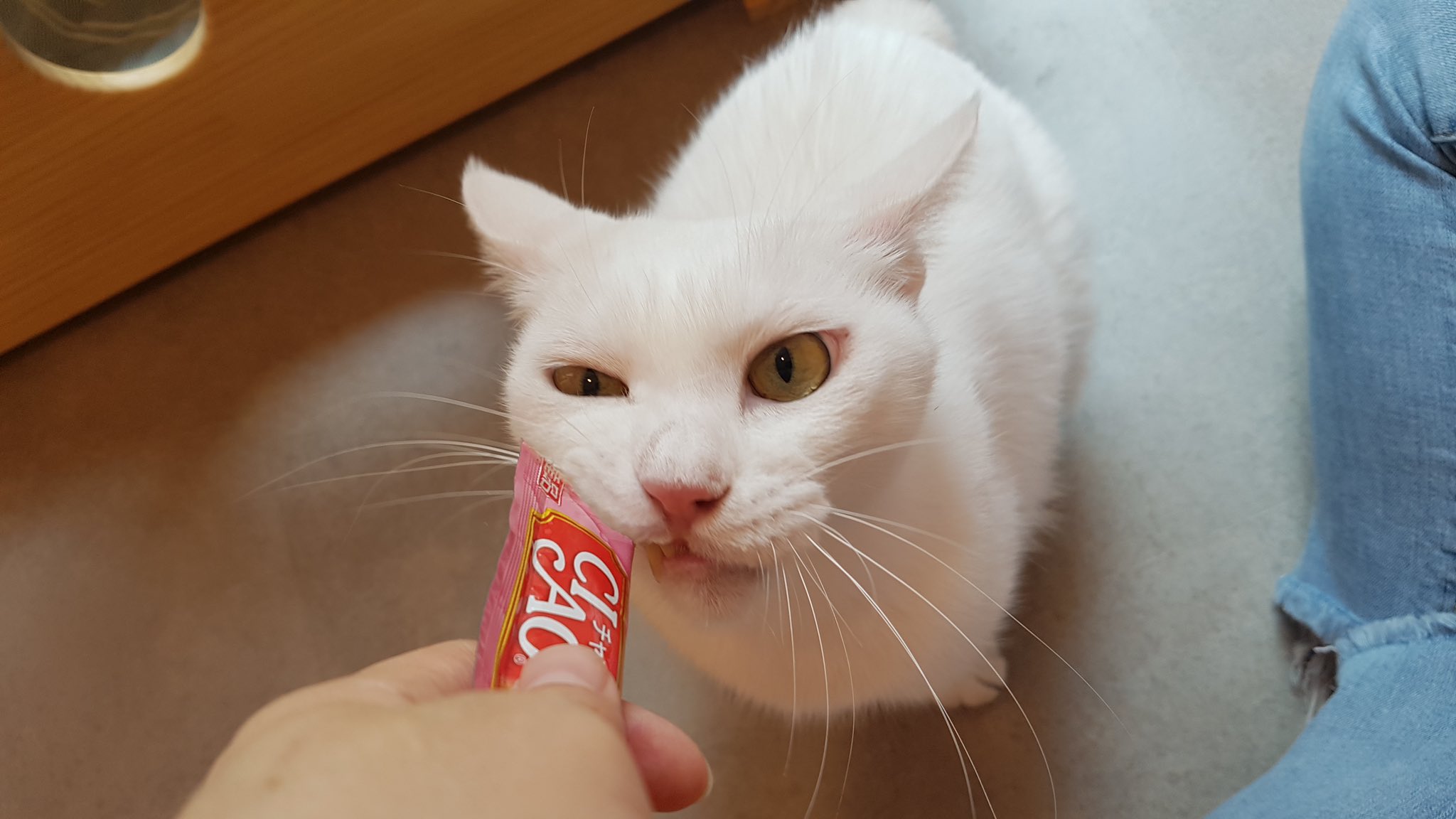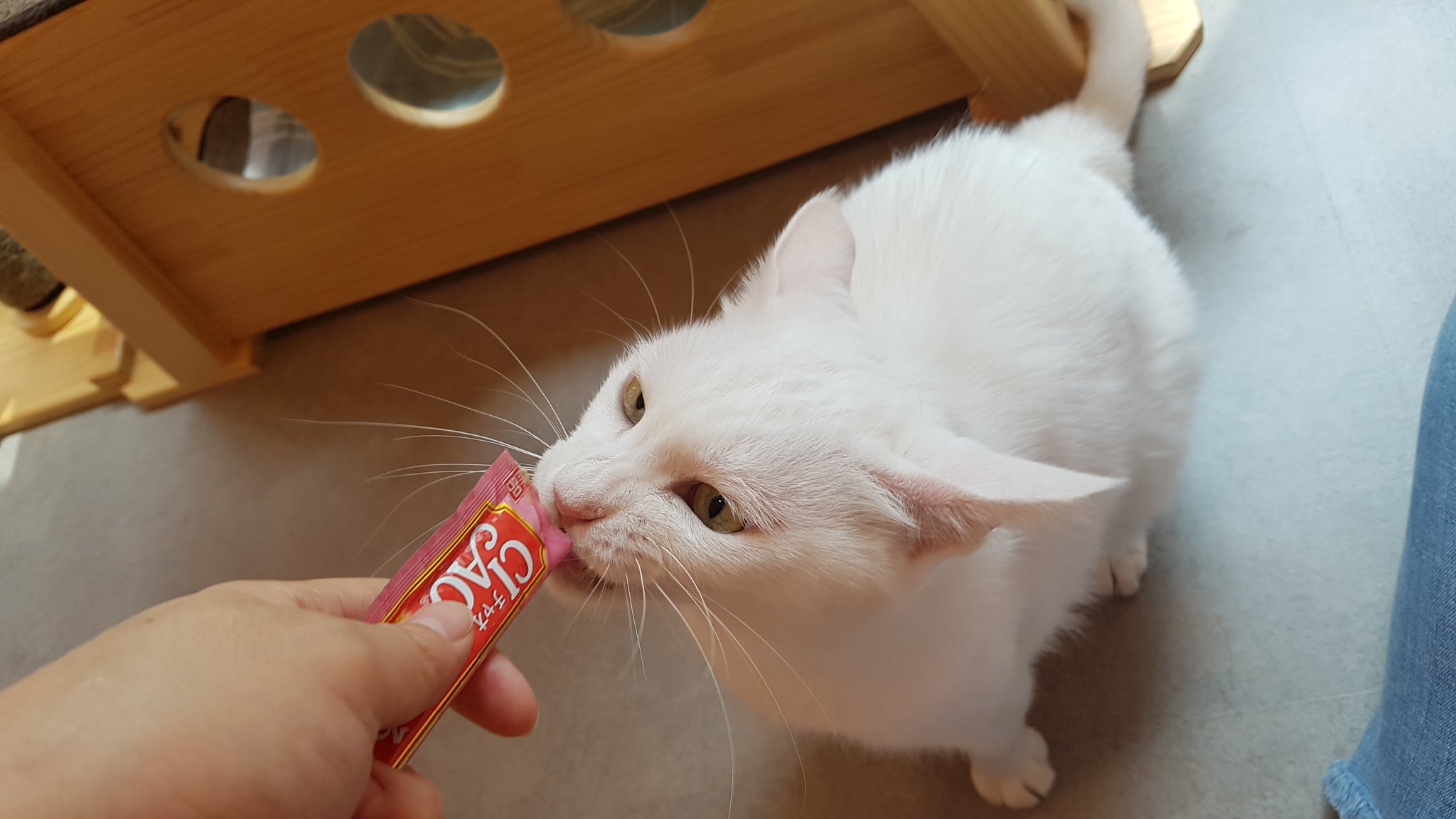 마시는 어떤 간식이던 가리지 않고 잘 먹는다. 주식 캔도 마찬가지. 건강한 체중관리를 위해 간식은 잘 주지 않고 종종 주식캔을 주는데 차오 츄르 먹을 때는 아주 격하다. 가끔은 짜먹는 요거트를 든 나를 보고 츄르인 줄 알고 쫓아다니며 달라고 한다.