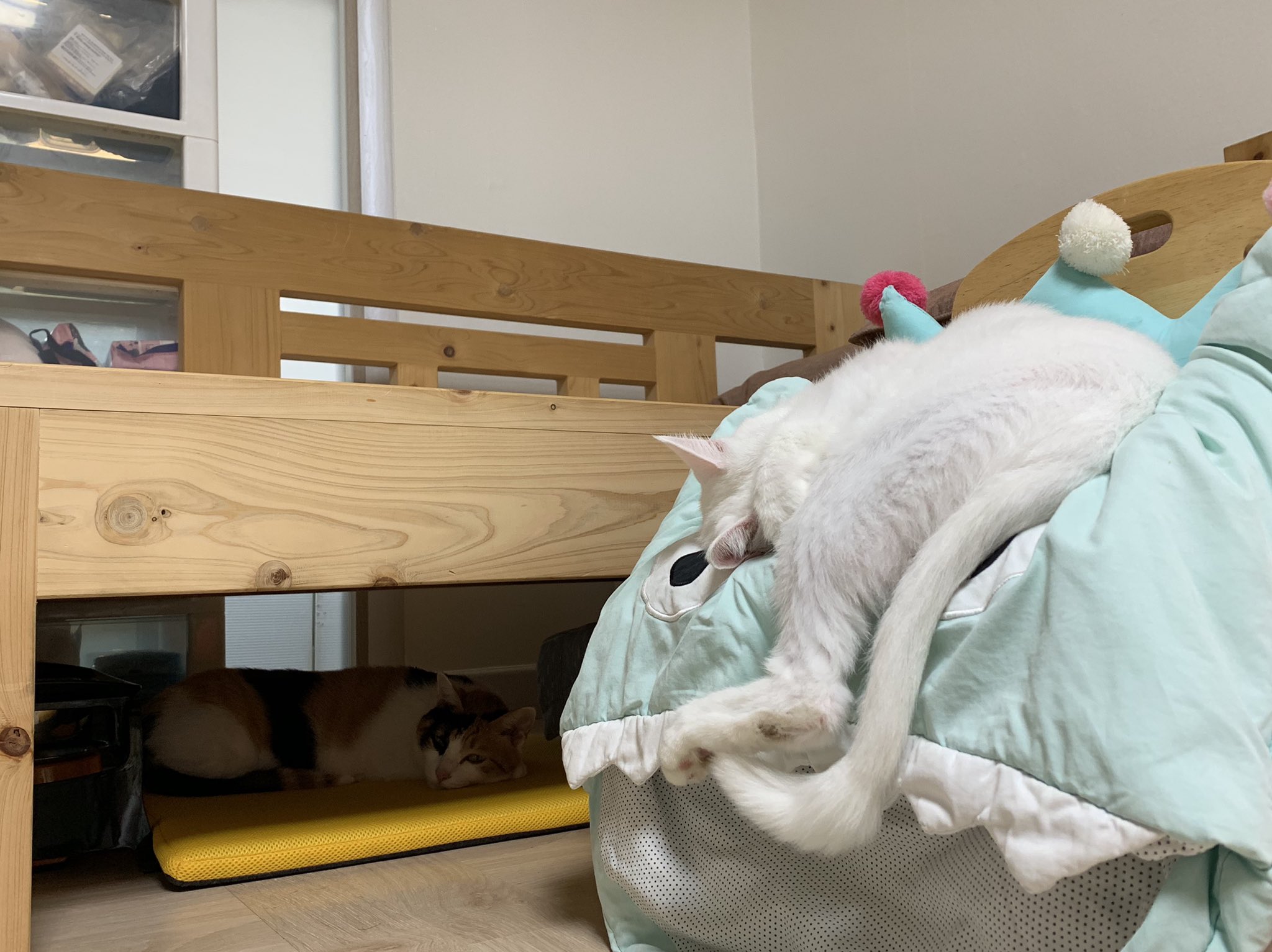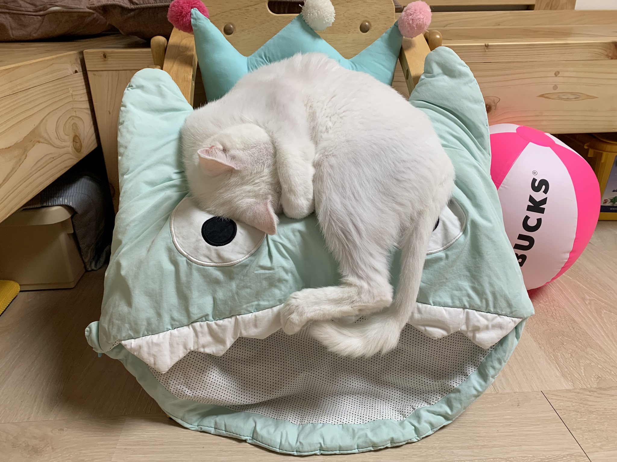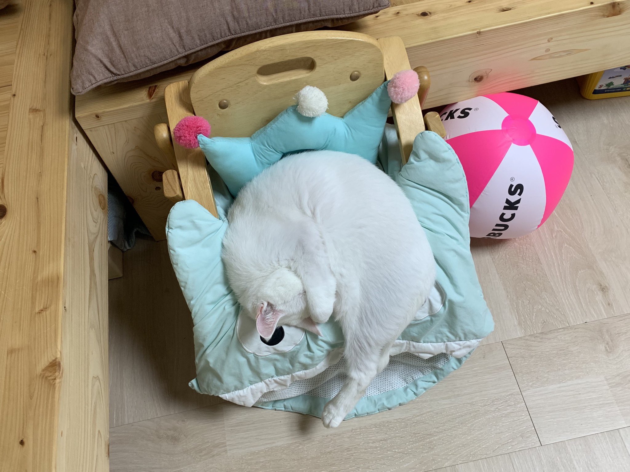 아기의자 중에 원목의자(야마토야 아치 체어)가 있다. 원목이라 딱딱해서 상어 보낭을 쿠션처럼 끼워놨더니 마시가 더 좋아해서 아기의자에 매일 앉아있더라는. 요즘은 상어 보낭도 원목의자도 꺼내놓질 않아서 볼 수 없는 광경이다.