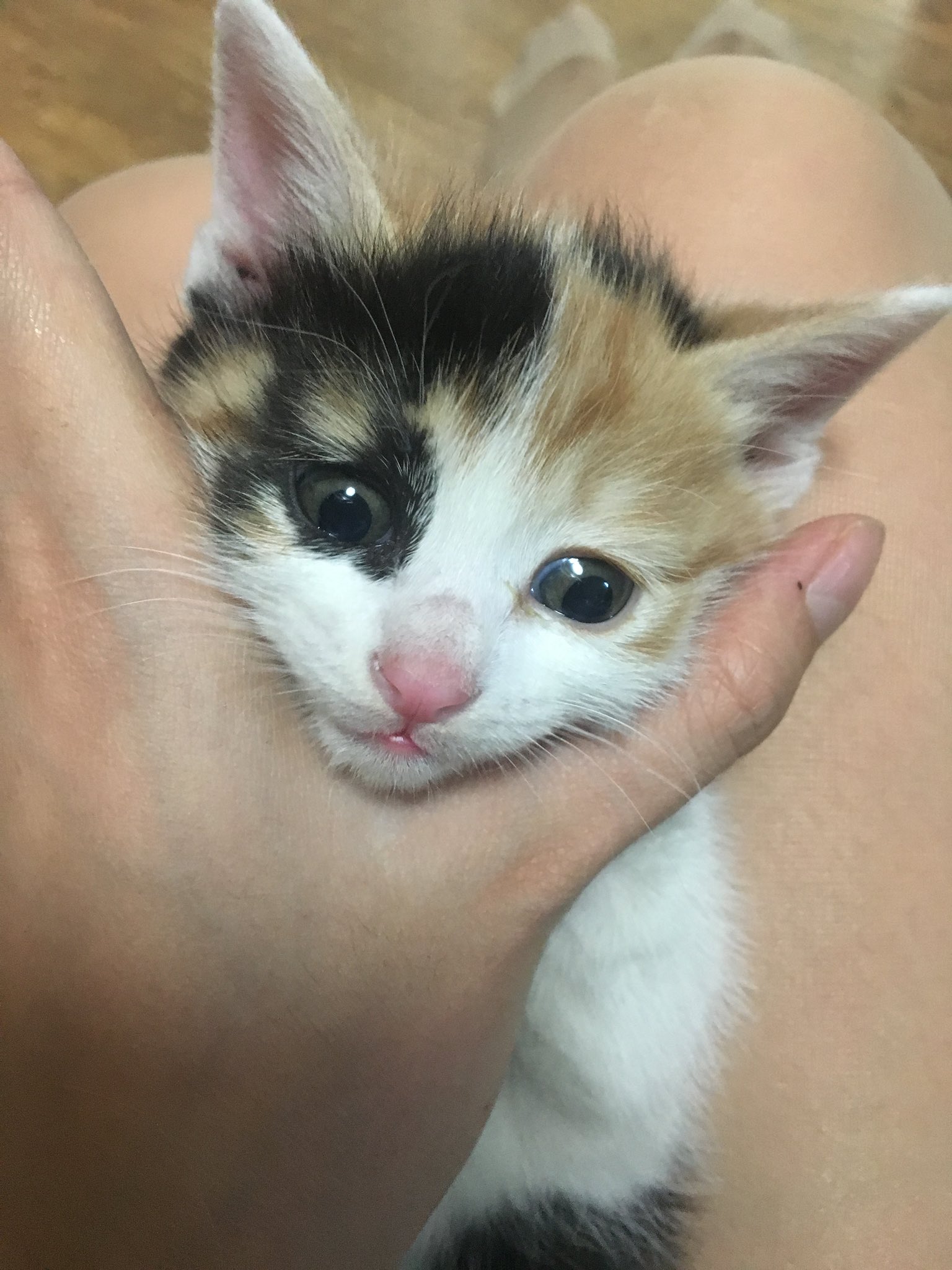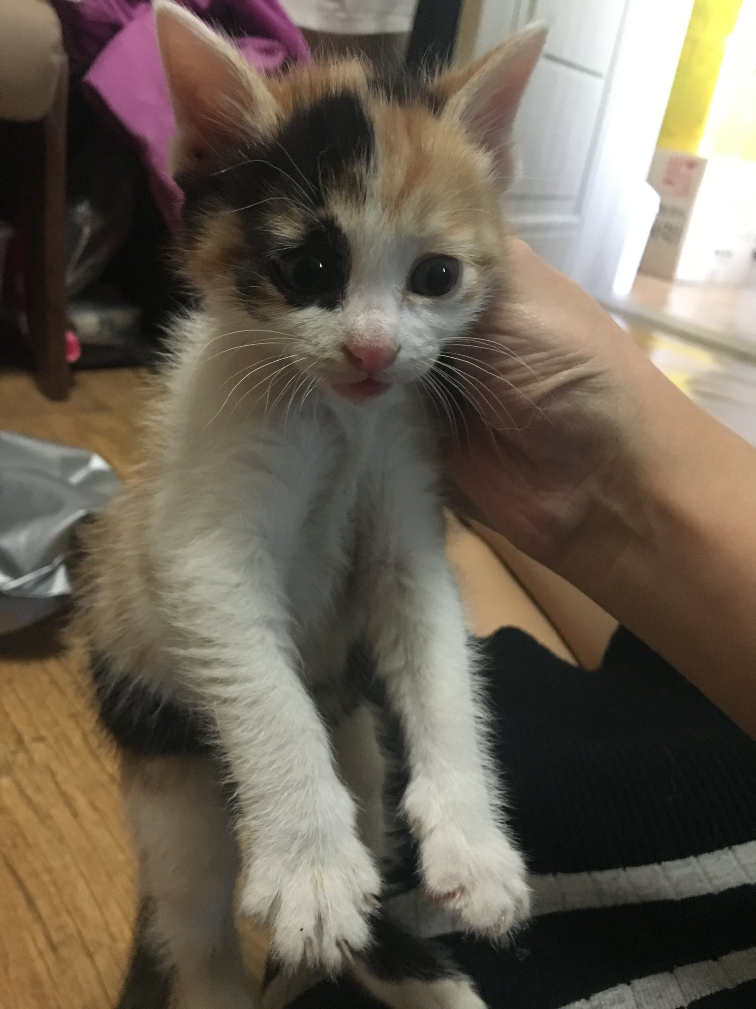 마요나를 처음 만났을 때 아주 말끔했어요. 어미가 거처를 이동하다 혼자 떨어진 게 아닐까 생각합니다. 이 날은 아침부터 아기 고양이의 높은 울음소리가 들려서 밖을 내다보았습니다. 맞은편 집 2층 발코니에서 콩만 해 보이는 게 목청껏 울며 꼬물꼬물 움직이고 있었어요. 남의 집이기도 했고, 어미가 데려가겠지 하고 안 들리는 척해보았었죠. 저는 이미 여러 번의 임시보호와 입양 보낸 경험을 가지고 있었고, 솔직히 말하면 그 무게가 무거워 더 이상 들여다보고 싶지 않았어요.