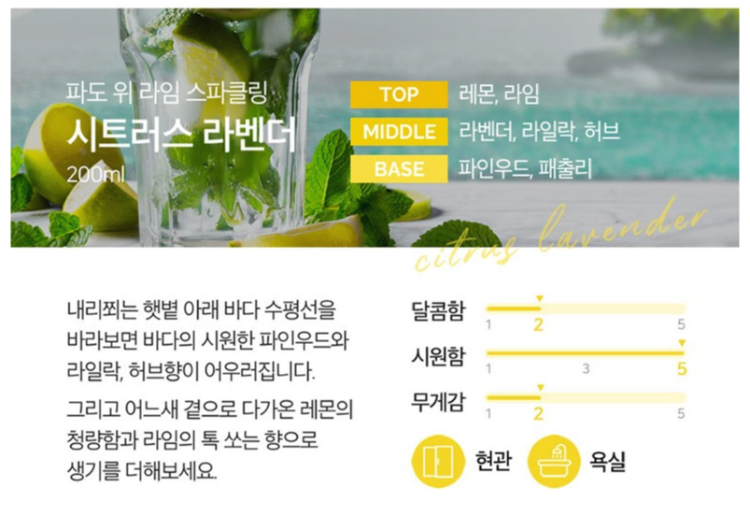상품 설명에 보니 에이프릴 프레쉬 향은 침실이나 사무실, 시트러스 라벤더는 현관이나 욕실에 추천한다고 한다. 내 취향엔 시트러스 라벤더가 더 좋은 것 같다.
