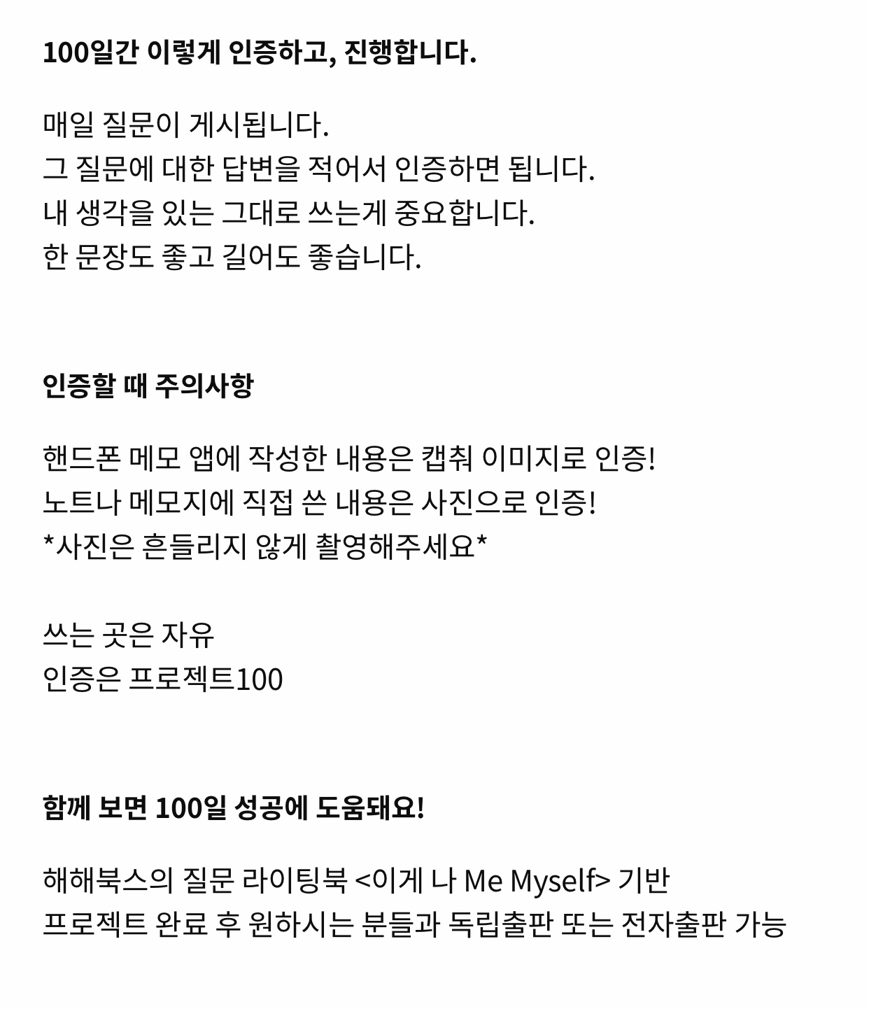 내가 참여한 프로젝트는 독립출판사인 해해북스에서 주관하는 '나와 마주하는 100일 백문백답 (Q&A)'이다. 프로젝트 목록에서 제일 처음 눈에 띄어서 살펴봤는데 프로젝트 설명이 마음에 쏙 들어서 참여를 신청했다. 어떤 질문이 매일 나올지 궁금하기도 하고 백문백답을 통해 나를 좀 더 가까이 들여다보게 되는 시간이지 않을까 기대가 된다.