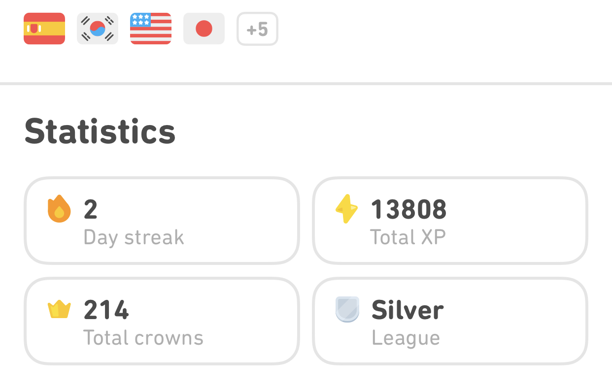 한국어가 있는 이유는 영어 사용자로 한국어는 얼마나 레벨이 나오는지 궁금해서 해봤는데, 영어 문장 구조에 미숙해서인지 생각처럼 점수가 잘 나오지는 않더라. 요즘에는 스페인어만 하고 있다. 며칠 만에 다시 했더니 오늘 연달아 듀오링고를 한 게 이틀째다. 처음 시작했을 때랑 시스템이 바뀌어서 앞부분 챕터부터 다시 진행 중이다. 안 하다가 하니 기억이 잘 안나는 게 문제.