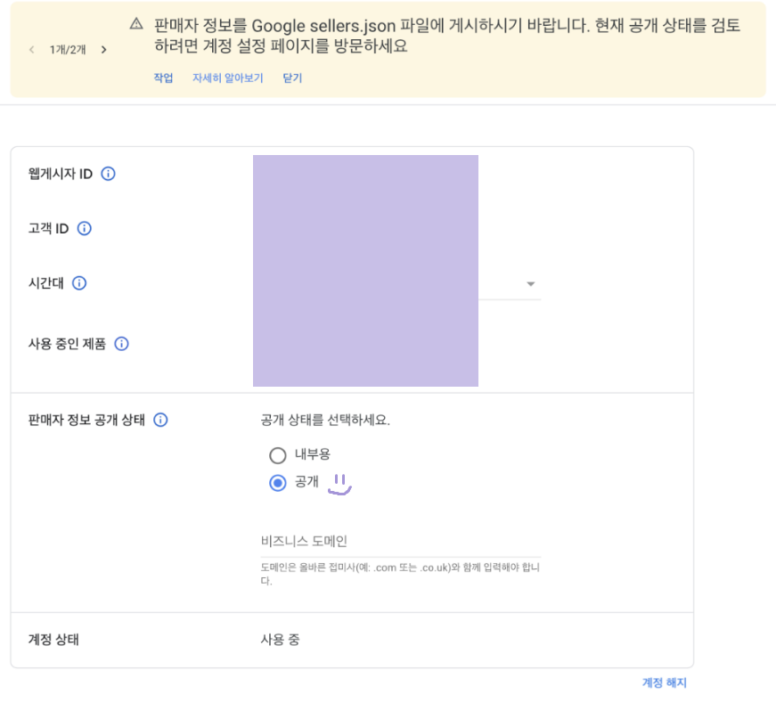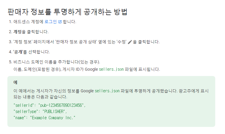 ads.txt랑 달리 페이지가 하나뿐이라 왜 이리 불친절해? 생각했는데, 다시 보니 판매자 정보를 투명하게 공개하는 방법이 친절하게 쓰여있다. 우리는 단지 계정 정보 페이지의 판매자 정보 공개 상태를 '공개'로 선택하기만 하면 된다.