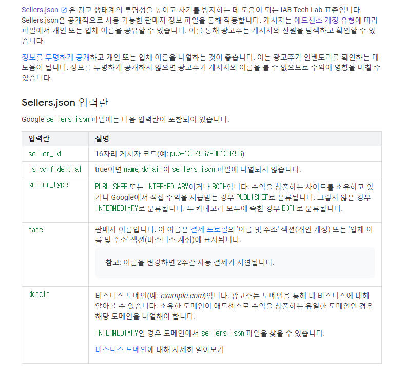 구글 애드센스 고객센터에서 sellers.json으로 판매자 정보 제공하기 페이지를 확인했다. 여기서 판매자는 광고를 달고 있는 블로그 또는 웹사이트 사용자를 의미하는 것 같다.