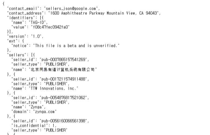 공개 설정 시 sellers.json 공개된 정보는 구글 바이어 고객센터에서 안내하는 대로 다음 URL에서 확인 가능하다. realtimebidding.google.com/sellers.json