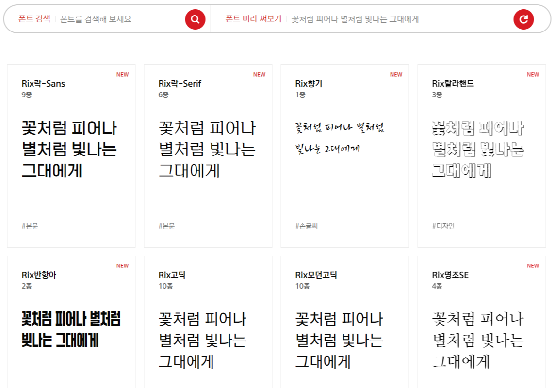 산돌구름에서도 잠깐 언급한 릭스폰트에서도 클라우드 서비스를 지원하고 있다. 릭스폰트에서 공급하는 폰트는 사이트의 첫 메뉴인 폰트 보기를 통해서 쉽게 확인할 수 있다.