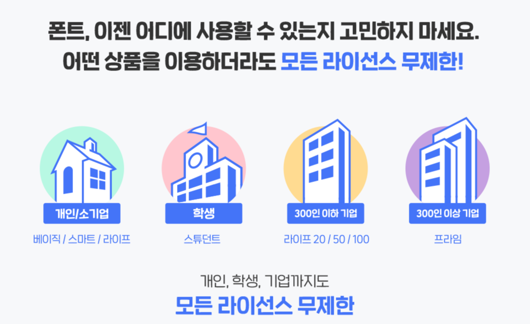 폰트릭스의 클라우드를 결제 시 모든 사용범위에 대해 권한을 가진다. 결제기간 동안 어느 범위에 사용할 수 있는지 고민하지 않아도 된다. 자세한 정책은 RixFont 클라우드 라이선스 정책 문서에서도 확인할 수 있다.