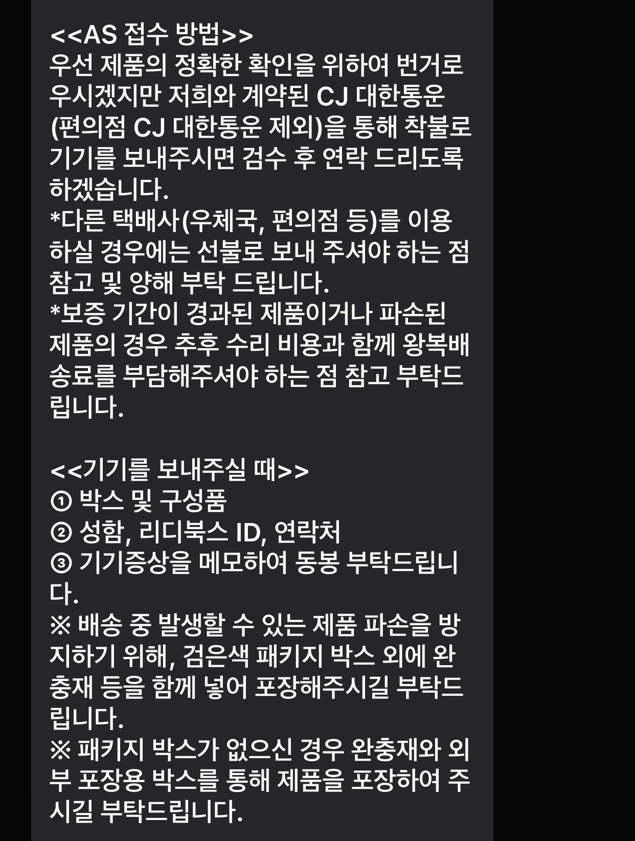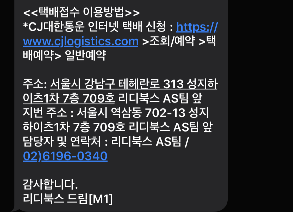 - 리디북스 AS팀으로 CJ대한통운을 이용해 기기를 착불로 발송합니다.