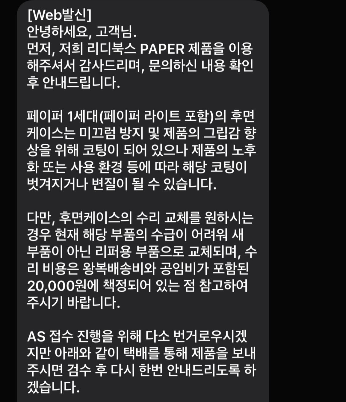 리디페이퍼 라이트를 오래 사용하다 보니 뒷면의 플라스틱이 끈적끈적해졌어요. 고객센터에 문의했더니 페이퍼 1세대(리디페이퍼, 리디페이퍼 라이트)의 후면은 그립감 개선과 미끄러움 방지를 위해 코팅이 되어있는데 오래되면 코팅이 벗겨지거나 끈적해질 수 있다고 해요. 보상기간을 훌쩍 지난 제품이라 유상 AS가 된다고 하는데 후면 교체의 경우 택배비까지 2만 원의 비용이 들어요.