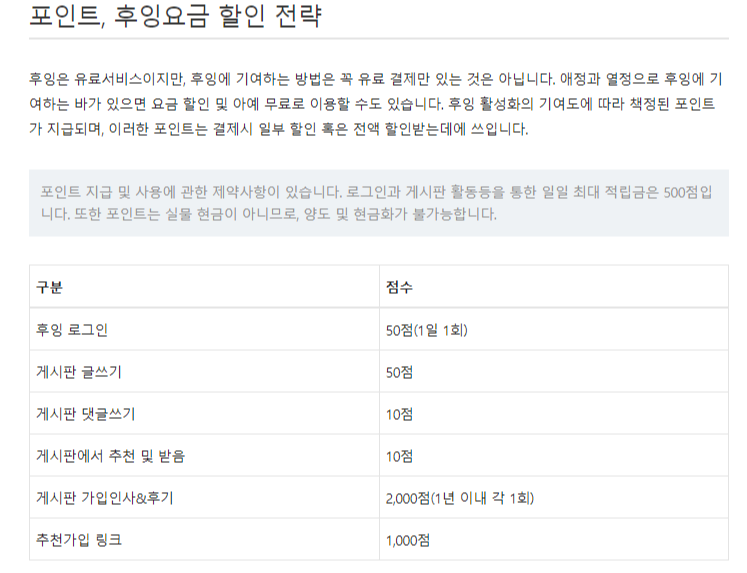 후잉이 온전히 무료는 아니지만 포인트로도 결제가 가능한데요. 매일 로그인, 게시판에 글쓰기 또는 댓글쓰기, 다른 글 추천을 하거나 받는 등의 행위를 통해 포인트를 얻을 수 있어요. 로그인이나 게시판 활동을 통해 일일 최대 적립금은 500점이라고 해요. 매일 500점의 포인트를 모은다고 생각하면 일주일이면 3,500점이네요.