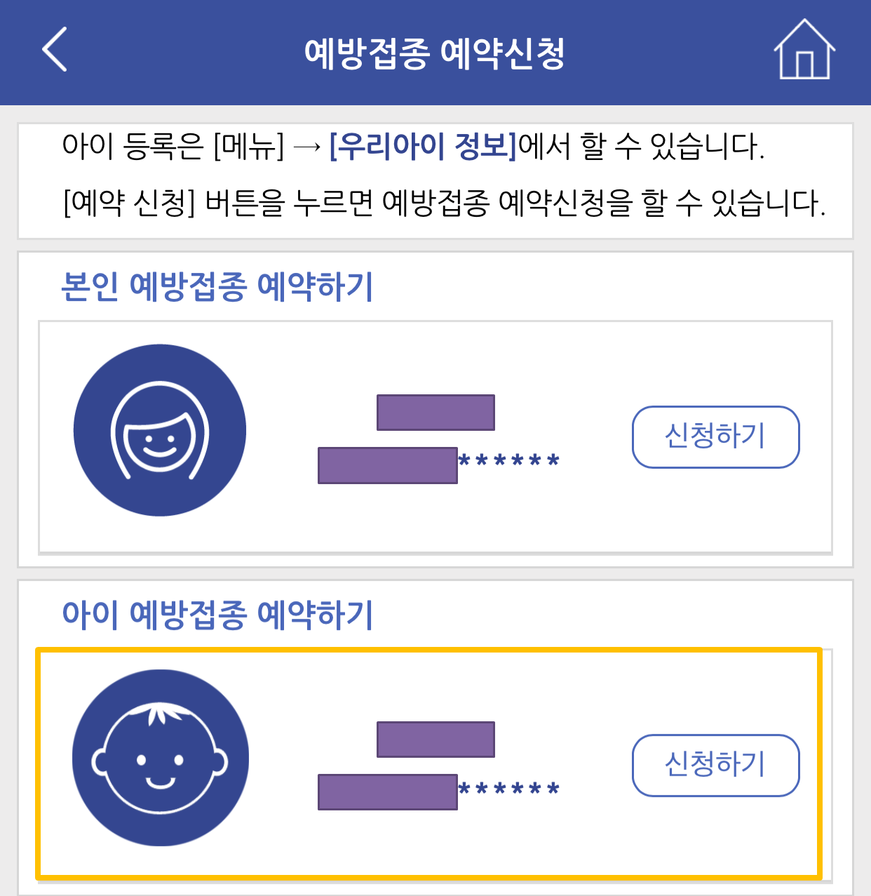 예방접종 예약신청을 누르면 신청 가능한 정보가 나와요. 본인과 아이 중 예방접종을 신청할 대상의 '신청하기'를 누르고 각 신청항목을 꼼꼼히 선택한 후 오른쪽 맨 위의 신청 버튼을 눌러줍니다.