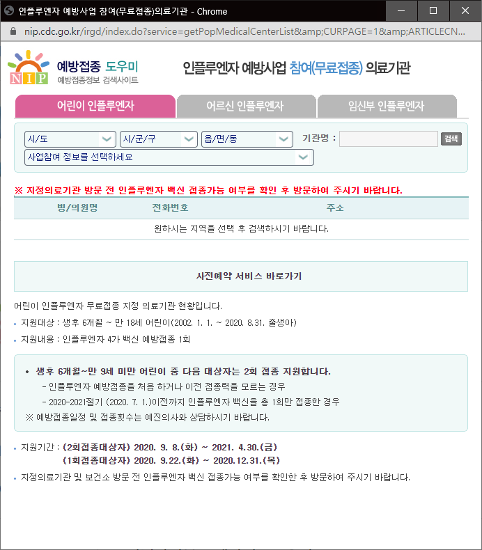 질병관리본부의 예방접종 도우미 누리집에 접속하면 인플루엔자 예방사업 참여(무료접종) 의료기관을 검색할 수 있는 팝업 창이 떠요. 예약 및 방문 전에 미리 확인해보는 것이 좋습니다.