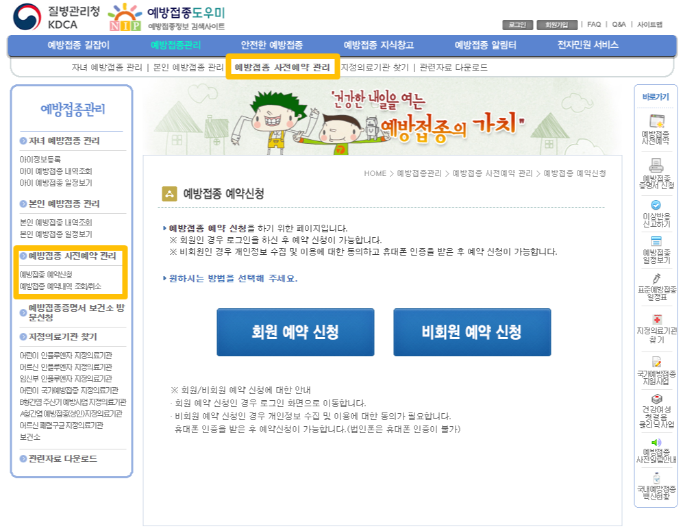 예방접종 도우미 사이트의 첫 화면에서 예방접종관련 서비스 중 가장 많이 이용하는 아이 등록, 내역 조회, 증명서 발급 바로가기를 찾을 수 있고요. 예방접종 관리-예방접종 사전예약 관리 메뉴에 들어가서 사전예약 신청 및 관리를 할 수 있어요. 예약 신청은 휴대전화 본인인증을 통해 비회원도 가능하지만 증명서 발급 등의 메뉴를 이용하기 위해서는 회원가입이 필수입니다.