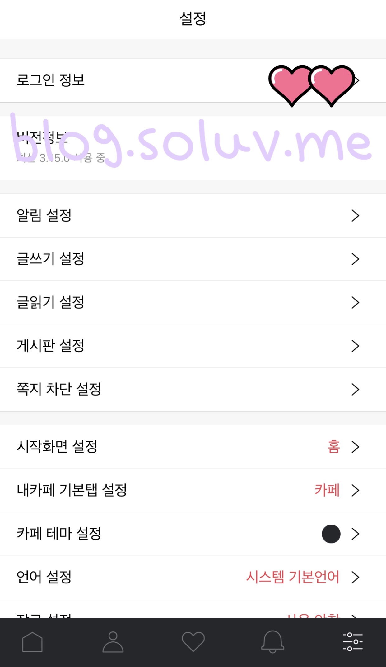- 다음 카페 앱 하단에서 오른쪽 설정 버튼을 누릅니다.