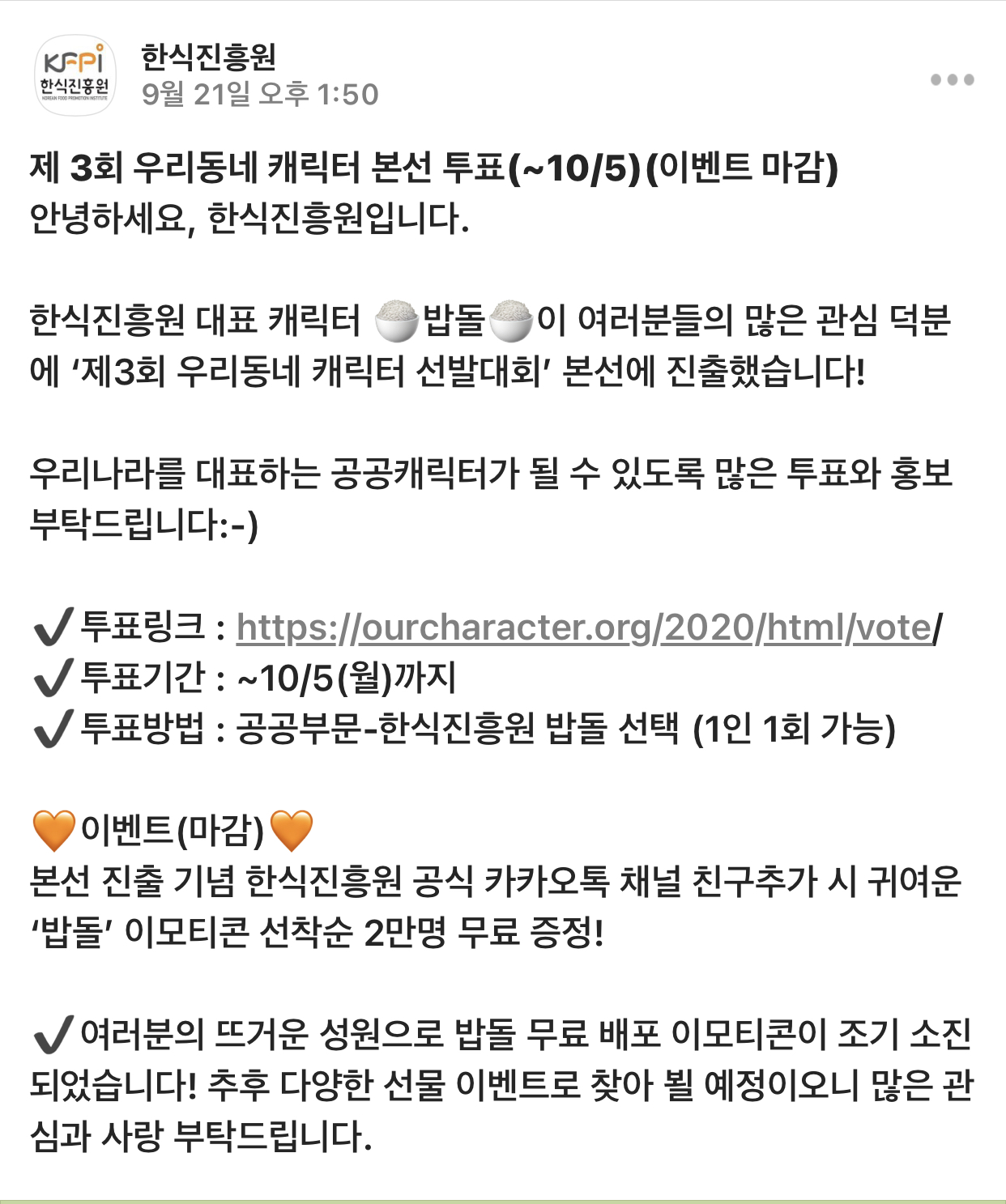 우리동네 캐릭터 밥돌이에 대해 찾아보다 보니 한식진흥원 카카오 스토리에서 플친 추가 이벤트를 하더라고요. 선착순 2만 명에게 밥돌 이모티콘을 선물로 준다고 해서 얼른 추가하고 보니까 선착순 종료가 됐다지 뭐예요?