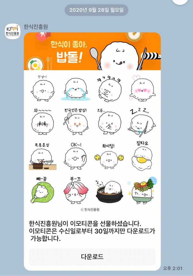 아니 이렇게 귀여운데 못 받는다고? 낙심하고 있었는데 오늘 한식진흥원에서 톡 메시지가 왔어요! 그래서 밥돌 이모티콘을 30일간 사용할 수 있게 됐답니다. 기간 한정 무료 배포 말고 구매해서 쭉 사용할 수 있었으면 좋겠네요.