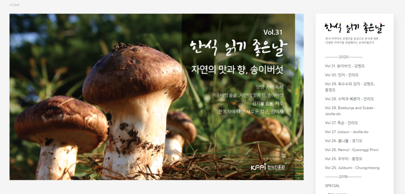 우리동네 캐릭터 밥돌에 대해 검색하다 보니 한식진흥원에서 발행하는 웹진이 있어서 공유해요. 한식과 식재료에 대한 다양한 글들이 매월 발행된다고 하니 우리 식재료와 음식문화에 대해 관심 있는 분들은 살펴보시면 좋겠어요.