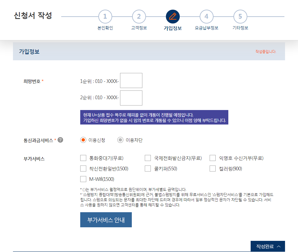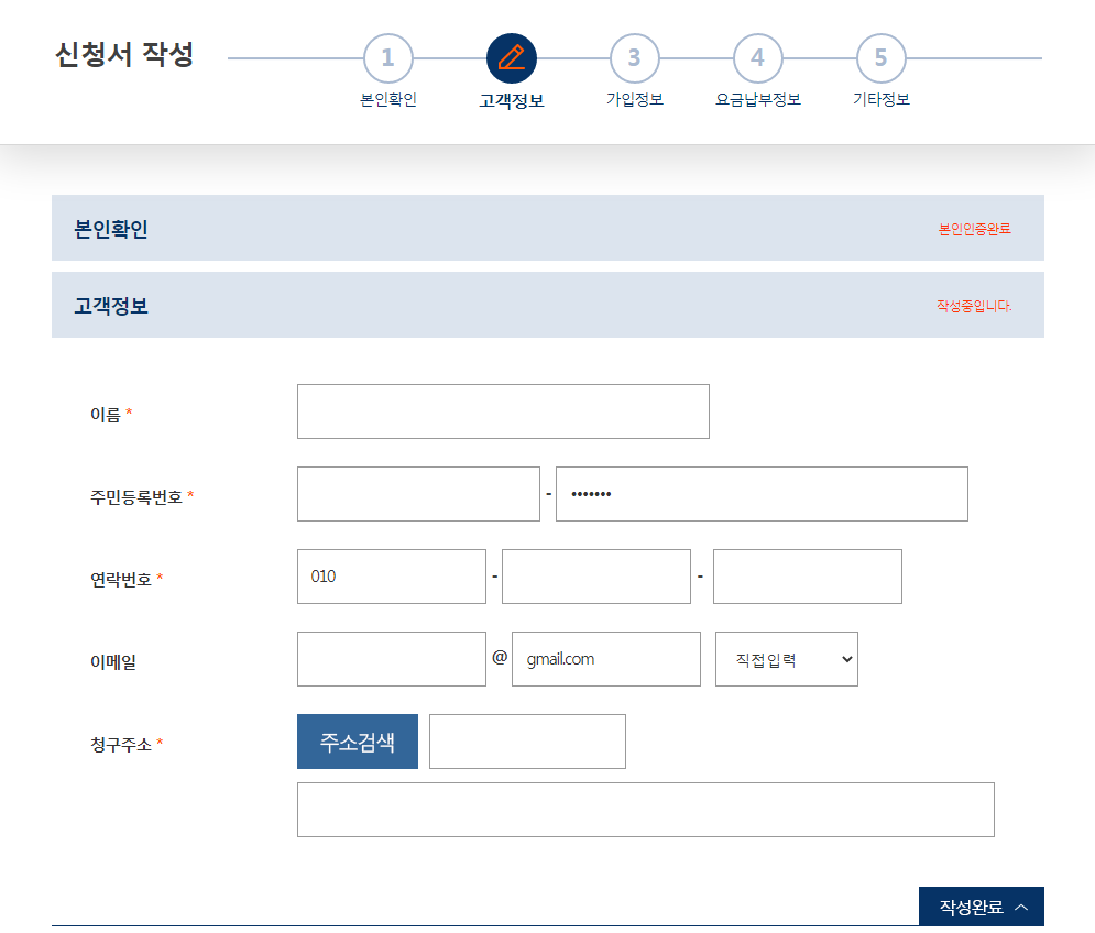 이름, 주민등록번호, 신분증 정보 등을 입력합니다. 개통 관련 연락받을 전화번호와 이메일, 청구 주소 등을 순서에 따라 입력하고 작성 완료를 누릅니다.