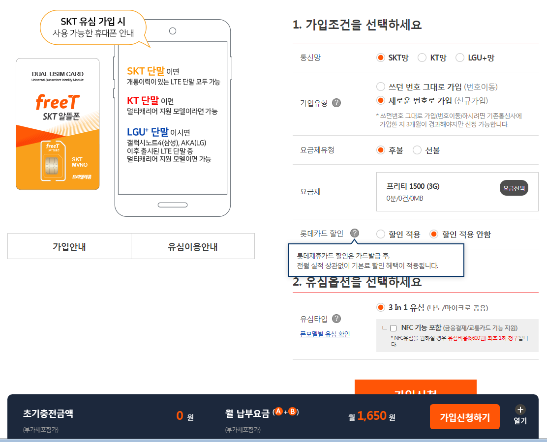 할인 기본요금 혹은 기본요금 옆의 작은 버튼을 누르면 오름차순과 내림차순으로 정렬을 할 수 있는데요. 제가 선택한 1,650원짜리 요금제는 SKT와 KT망이 있어요. 가장 기본 요금제이기 때문에 데이터, 음성, 문자 할당량이 하나도 없는데요. 수신만 하는 용도로 사용할 거라서 문제는 없습니다.