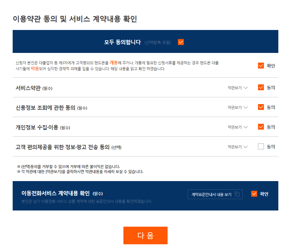 이용약관과 선택항목 포함 여부를 잘 읽어보고 선택합니다. 마지막 항목인 고객 편의제공을 위한 정보·광고 전송 동의는 선택항목이기 때문에 광고 전송을 원하지 않는다면 빼고 가입을 하면 됩니다.