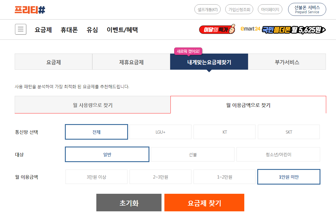 포털에서 프리티 알뜰폰을 검색합니다. 프리티 알뜰폰의 홈페이지에서 요금제 메뉴에 들어가면 내게 맞는 요금제 찾기를 선택할 수 있어요. 월 이용금액을 기준으로 확인할 거라서 월 이용금액으로 찾기에서 1만 원 미만의 요금제를 선택하고 요금제 찾기를 합니다.