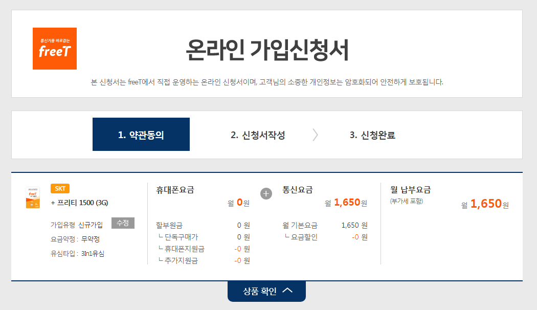문자로 인증만 받으면 되는 거라서 다른 기능은 생각지 않고 기본료가 저렴할 것만 생각했어요. 유지비용이 가장 적게 드는 방향으로 찾다보니 프리티 알뜰폰의 1,650원짜리 요금제를 선택했습니다.