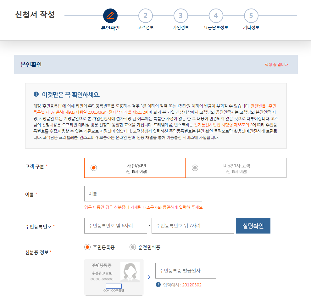 이름, 주민등록번호, 신분증 정보 등을 입력합니다. 개통 관련 연락받을 전화번호와 이메일, 청구 주소 등을 순서에 따라 입력하고 작성 완료를 누릅니다.