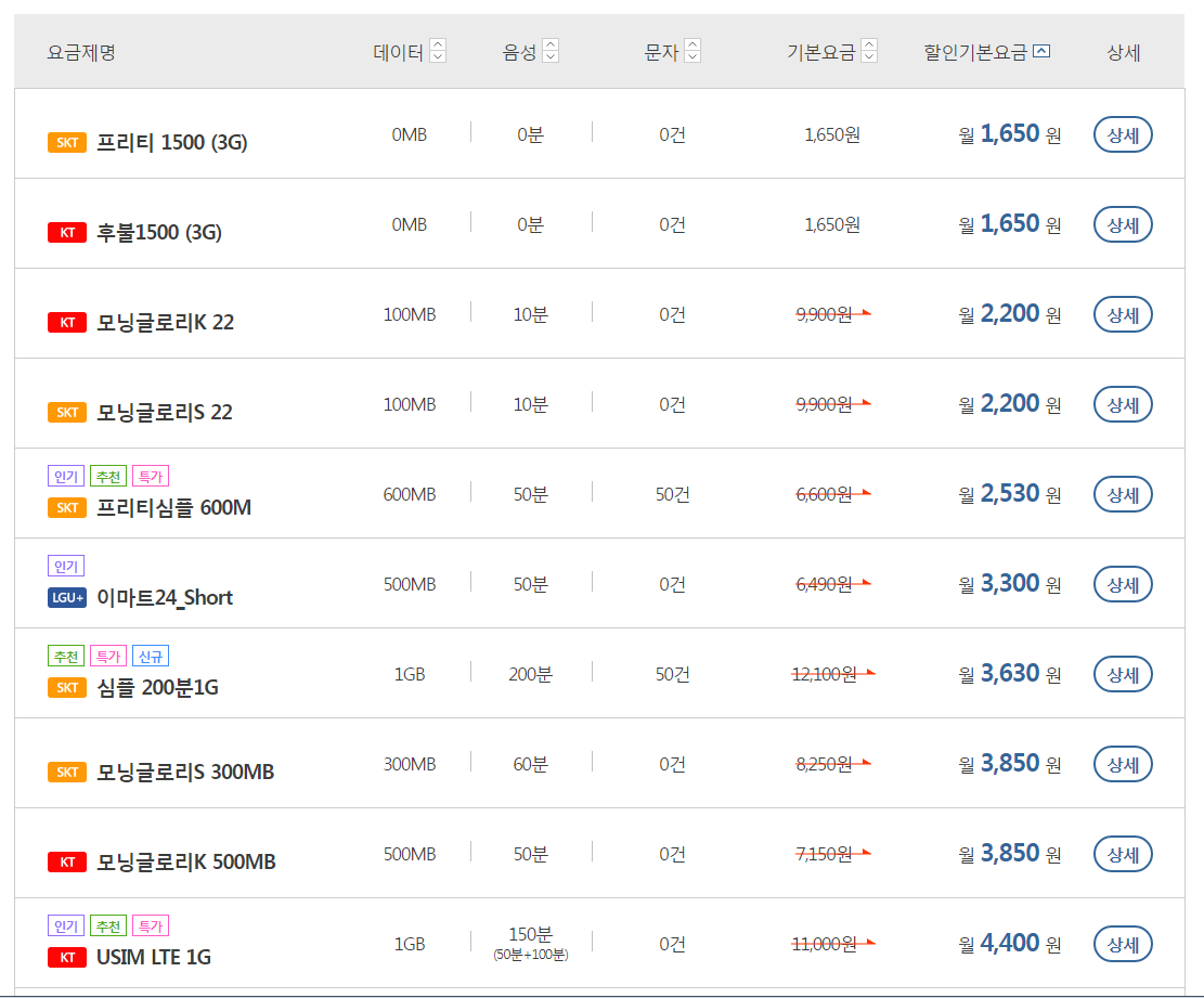 할인 기본요금 혹은 기본요금 옆의 작은 버튼을 누르면 오름차순과 내림차순으로 정렬을 할 수 있는데요. 제가 선택한 1,650원짜리 요금제는 SKT와 KT망이 있어요. 가장 기본 요금제이기 때문에 데이터, 음성, 문자 할당량이 하나도 없는데요. 수신만 하는 용도로 사용할 거라서 문제는 없습니다.