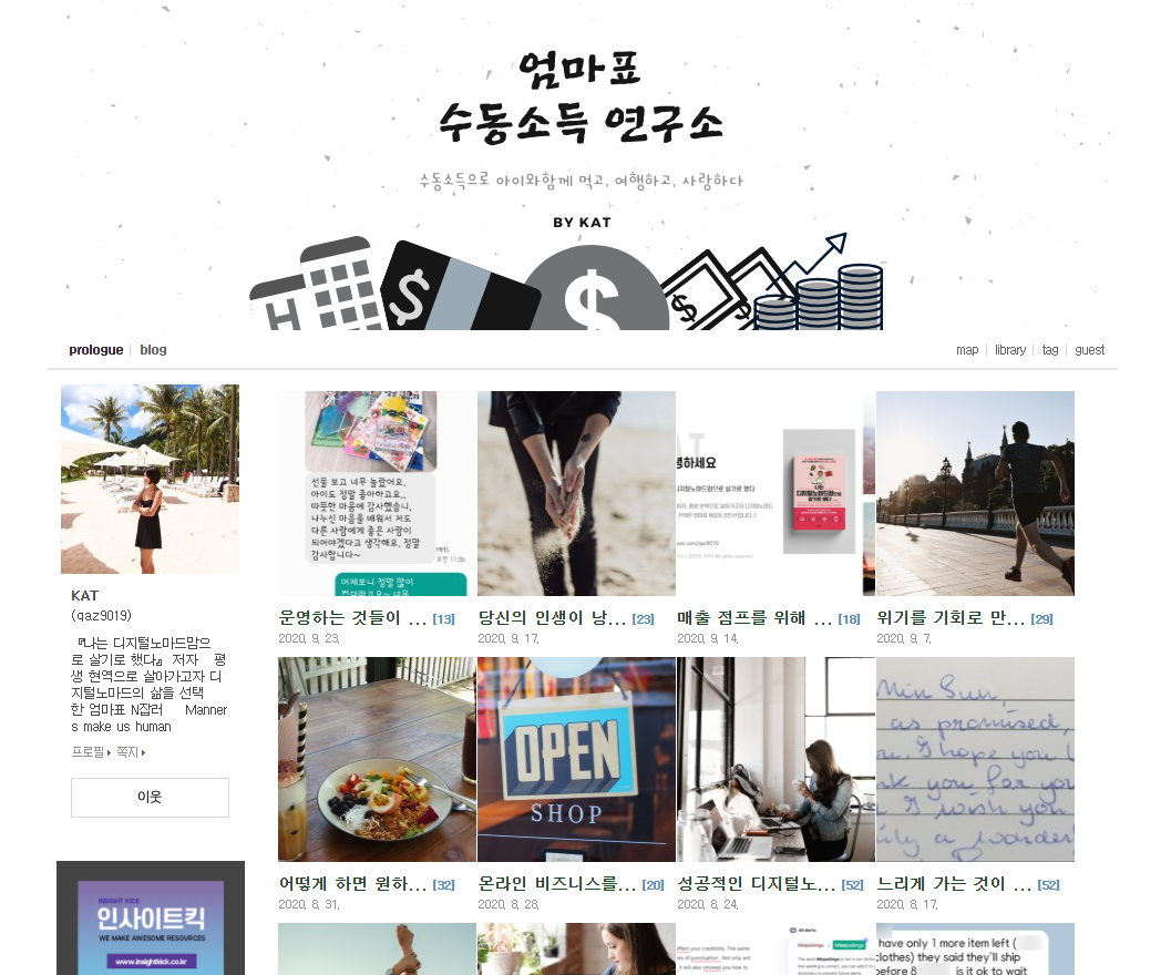 오늘 소개할 사이트는 지난번에 리뷰한 책, 나는 디지털노마드맘으로 살기로 했다의 작가 블로그입니다. 블로그의 이름은 엄마표 수동소득 연구소인데요. 나는 디지털노마드맘으로 살기로 했다에서 설명한 디지털노마드맘으로의 삶을 위한 여러가지 정보들이 계속 업데이트 되는 중이라 종종 구경가곤 해요. 작가님의 삶과 새로운 시도들에 대한 것들, 책에서 본 것처럼 쉽고 상세하게 설명되어 있어요. 책에 대해 궁금하다면 나는 디지털노마드맘으로 살기로 했다 : 책 리뷰를 확인해보세요.