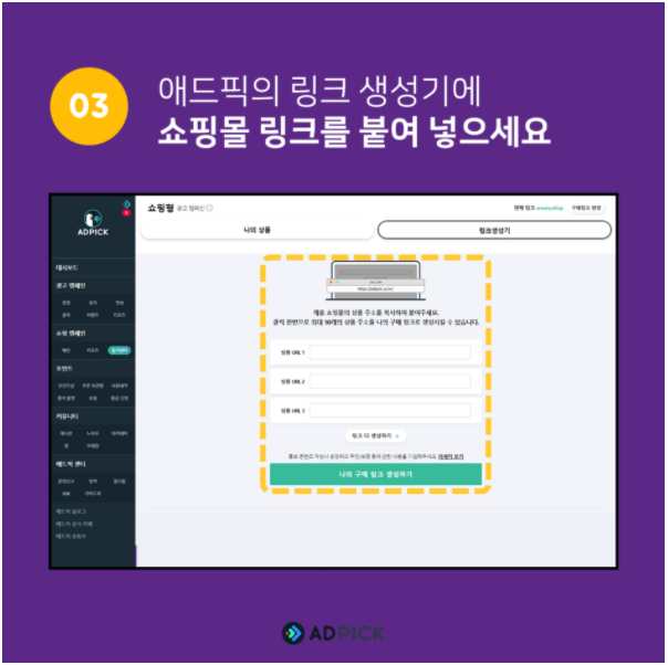 나는 애드픽에서 검색하는 것이 불편하다! 하는 분들은 쇼핑메이트 메인 하단 오른쪽에 있는 링크 생성 버튼을 누르면 편해요. 상품 주소를 복사해서 상품 URL 칸에 붙여 넣은 뒤 구매 링크 생성하기를 누르면 끝! 한 번에 10개까지 주소를 만들 수 있어요. 쇼핑메이트 이용하는 법 어렵지 않죠?