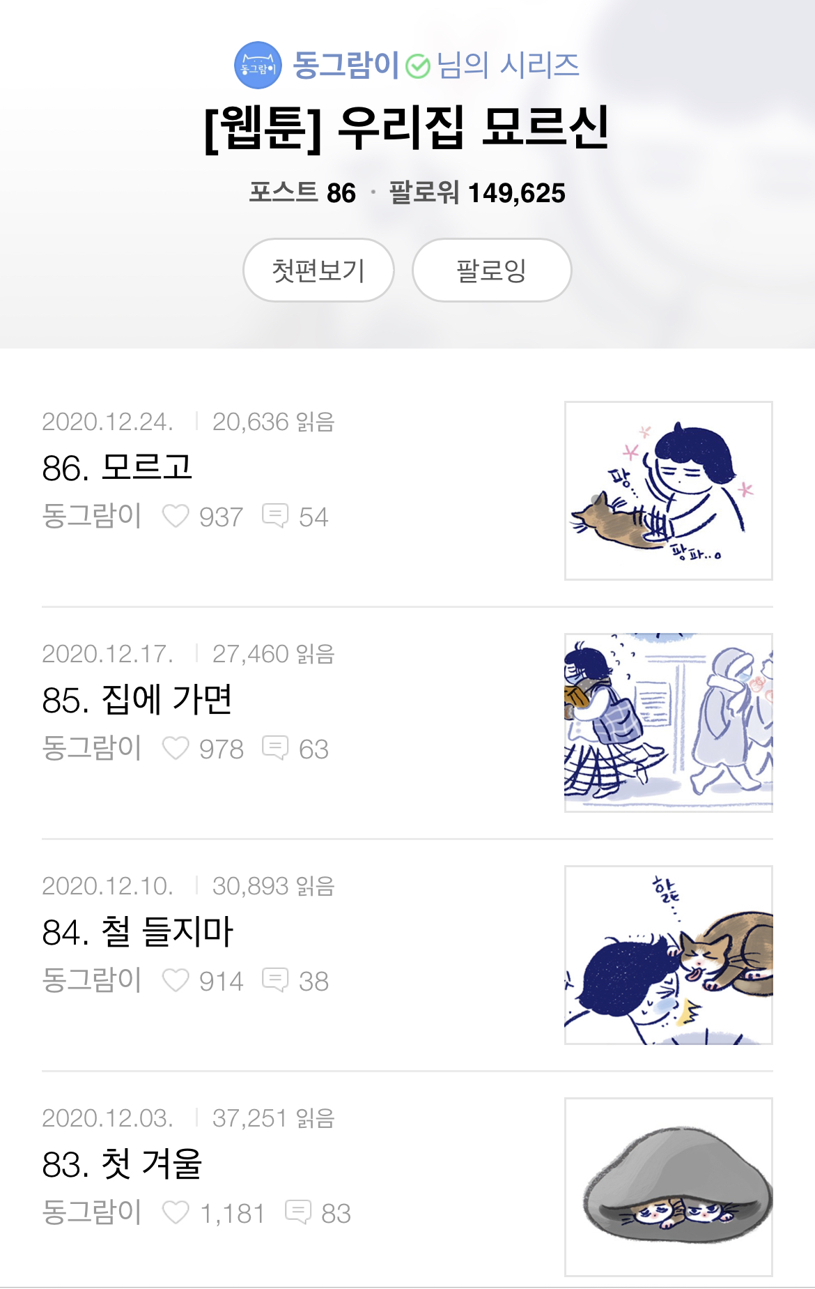 우리집 묘르신은 다음 완결 웹툰인 탐묘인간을 그린 순 작가님의 연재작입니다. 현재 네이버 포스트 동그람이를 통해 연재 중이에요.